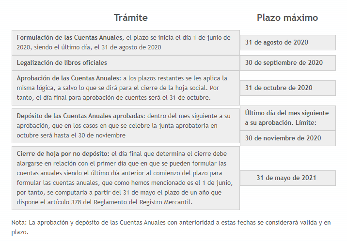 La aprobación y depósito de las Cuentas Anuales con anterioridad a estas fechas se considerará válidas y en plazo.